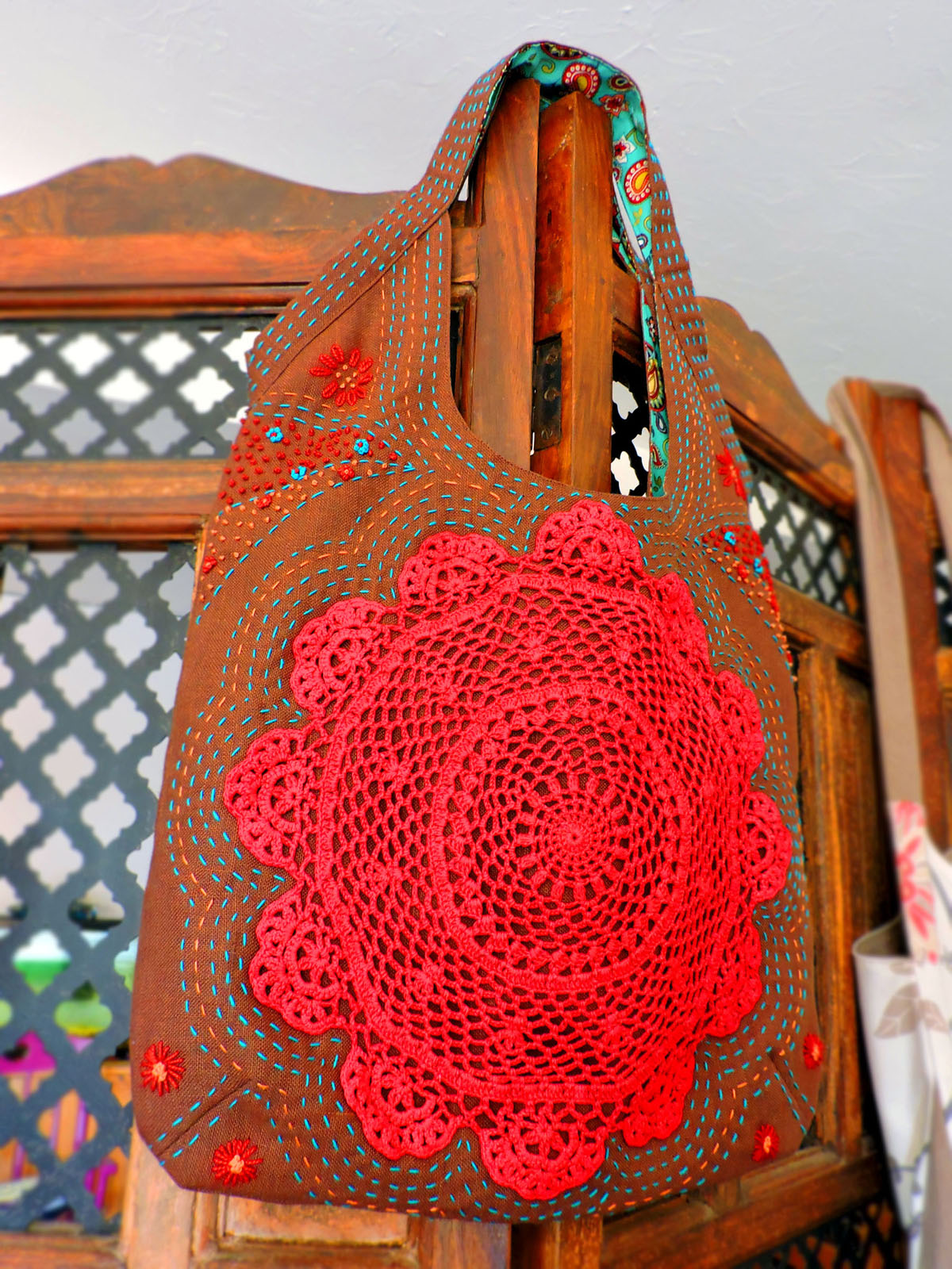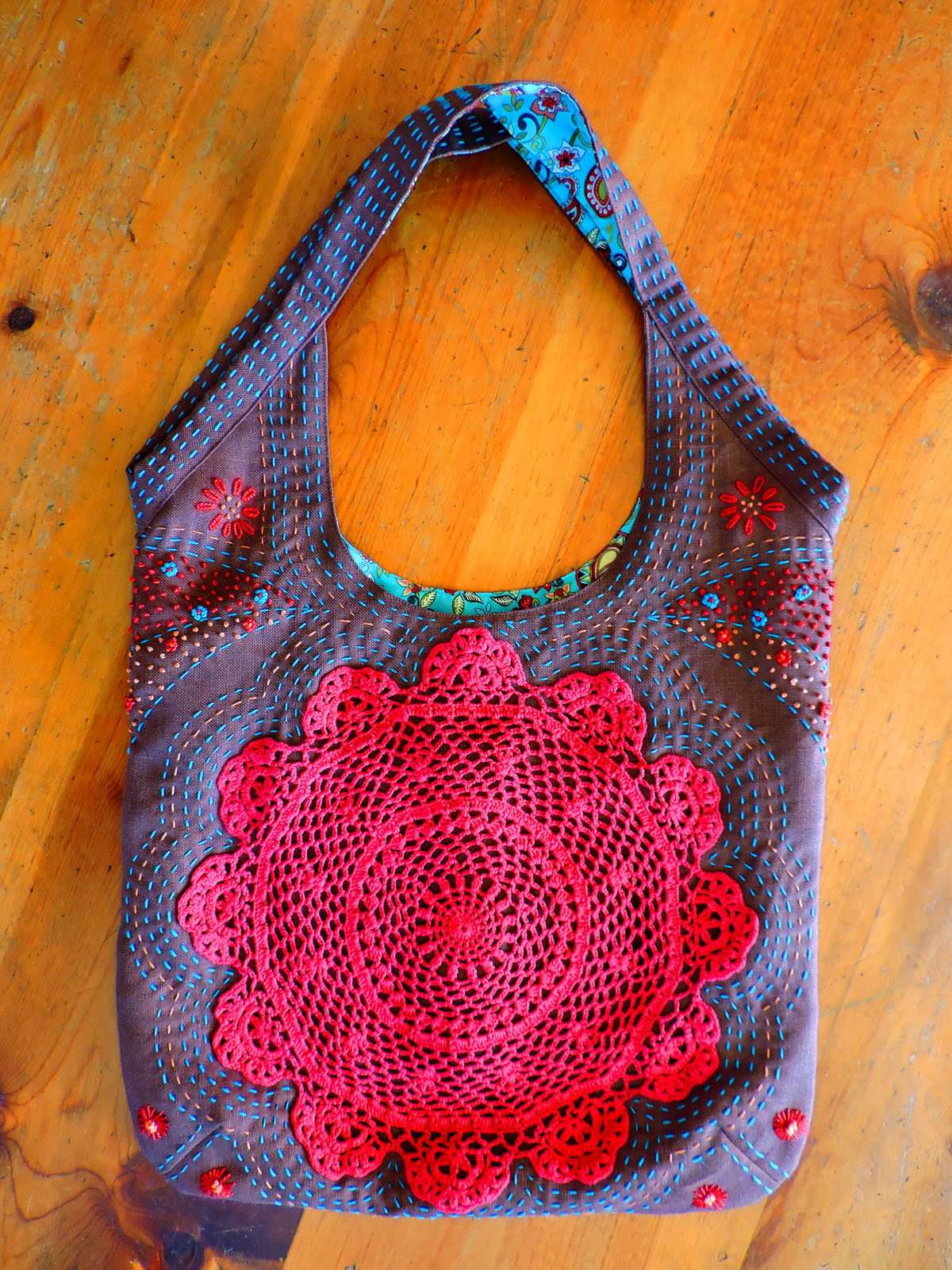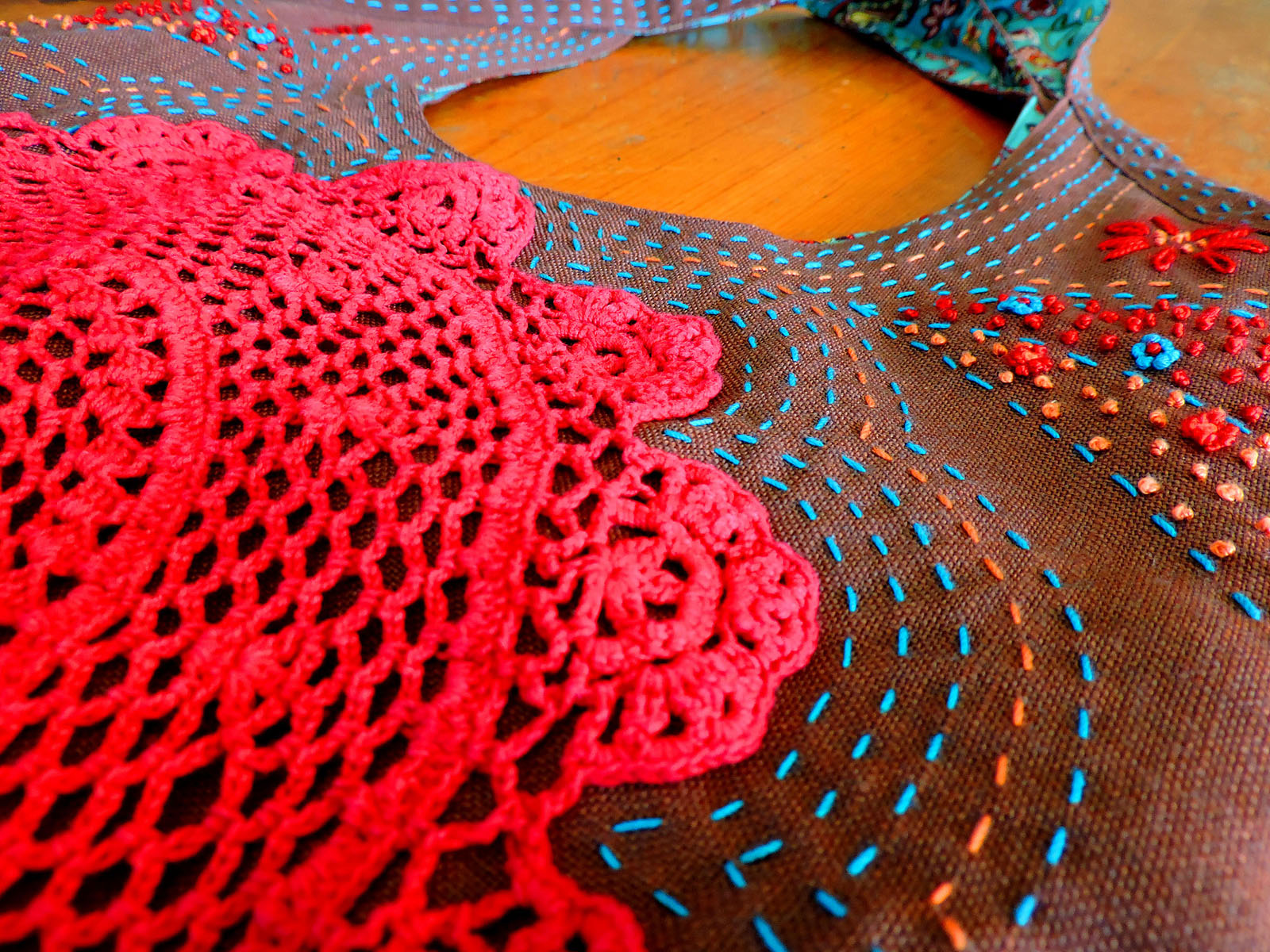 Around the doily, I hand-embroided lines, dots and flowers. On the back of the bag, a beautiful circle made