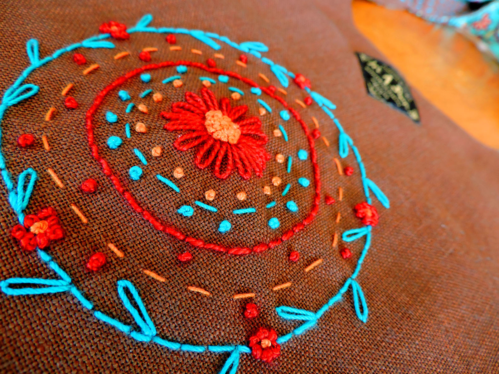 of a hand-embroided flower surrounded, again, by lines, dots, leaves and flowers. Symbol of life.